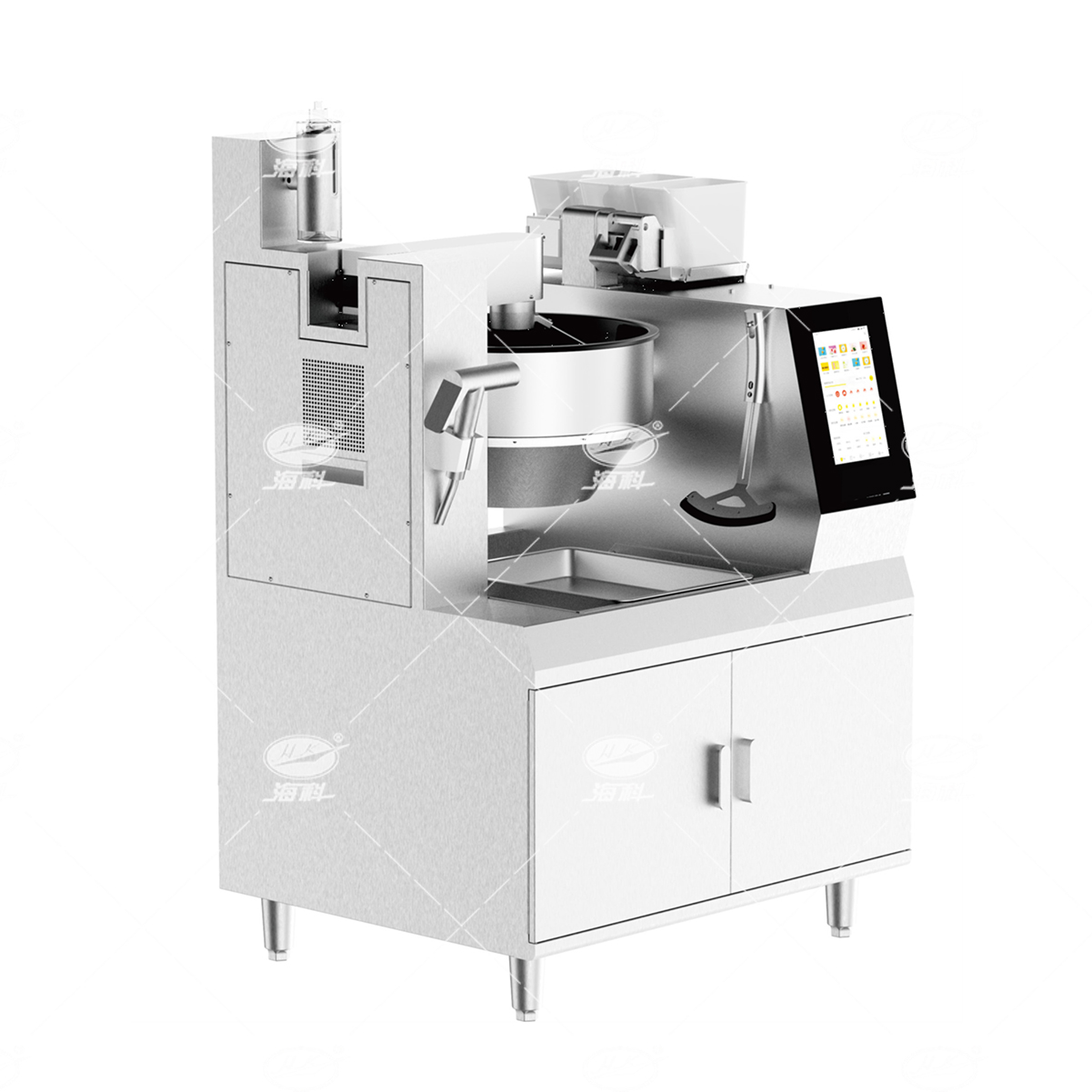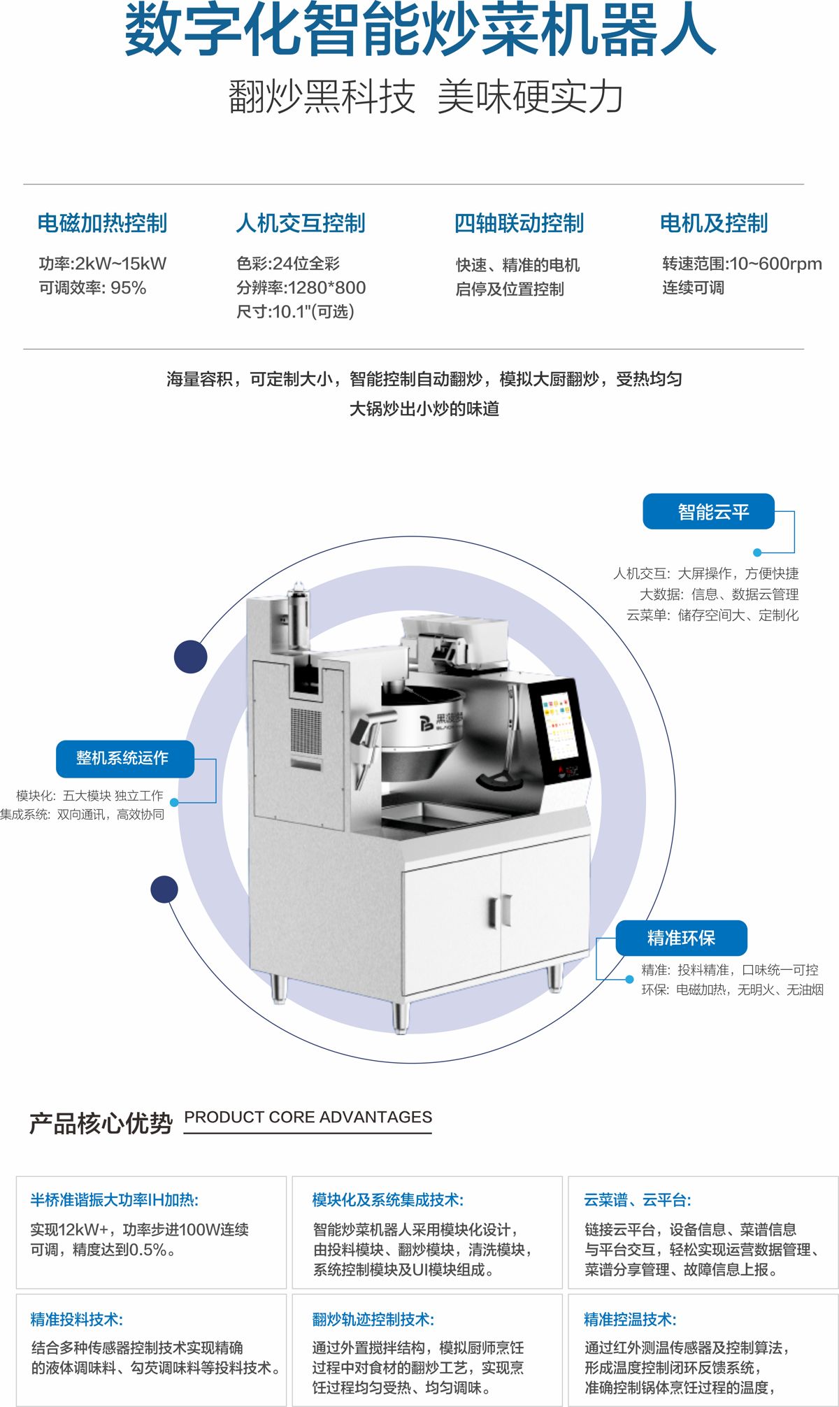 数字化智能炒菜锅则根据指令按菜品工艺执行炒制、按配方进行调味,机器手执行抓取净菜/调理肉/调料等动作,各模块协同运作,全面保障烹饪、调料、出餐持续稳定流畅进行。同时,小炒系统配置自动清洗功能,菜品炒制结束任务结束后,自动进行清洗。